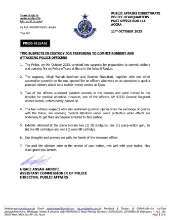 A statement issued by the police on Wednesday October 11, 2023 indicated that two suspected robbers who allegedly engaged the police in the gun battle during the operation to quell a planned robbery attack on the mobile money vendor at Ejura have been arrested.