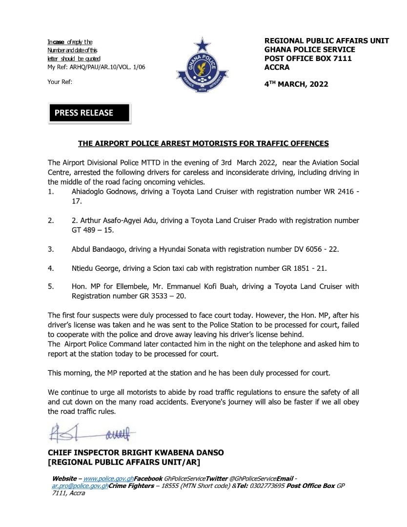 The MP was among a quintet of drivers that were arrested by the Airport Division Police MTTD on Thursday, March 3, 2022, for similar offences, including driving in the middle of the road facing oncoming vehicles.