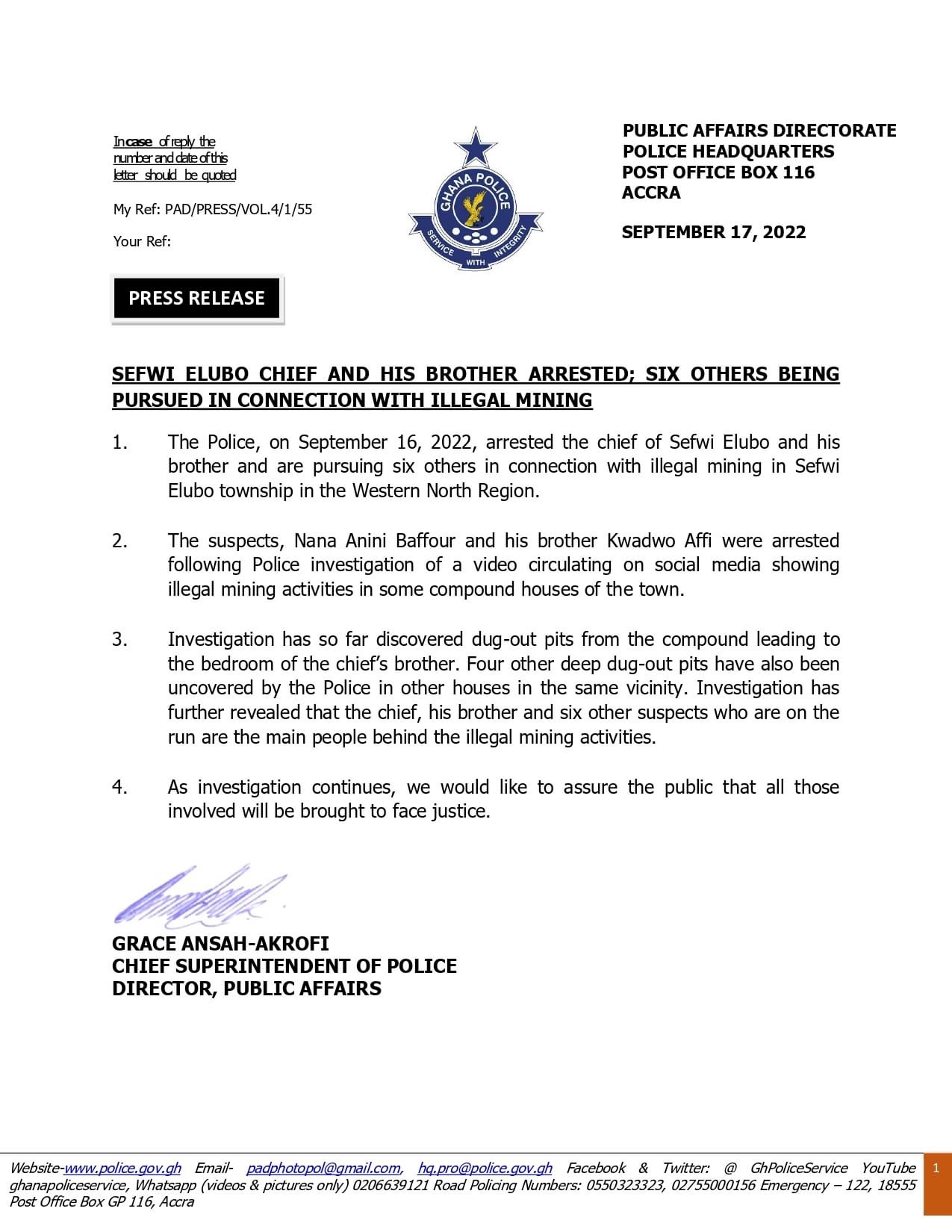 The Police, on September 16, 2022, arrested the chief of Sefwi Elubo and his brother and are pursuing six others in connection with illegal mining in Sefwi Elubo township in the Western North Region.