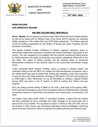The Ministry of Energy and Green Transition has announced the resumption of new drilling operations by Tullow Ghana and Eni Ghana in the Jubilee and Offshore Cape Three Points (OCTP) fields, respectively.