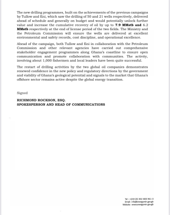 The Ministry of Energy emphasised that the renewed activity by the two oil giants underlines confidence in the government's regulatory policies and the country’s geological potential. It also sends a strong signal to the global market that Ghana remains an active player in offshore oil production, even as the world shifts towards a broader energy transition.
