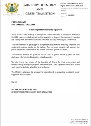 The Ministry of Energy and Green Transition has announced the completion of gas infrastructure upgrades by ENI, aimed at enhancing gas supply and supporting a reliable and sustainable energy future for Ghana.