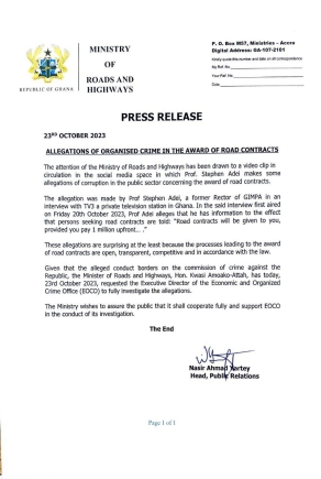 "Given that the alleged conduct borders on the commission of crime against the Republic, the Minister of Roads and Highways, Kwasi Amoato-Attah, has today, 23rd October 2023, requested the Executive Director of the Economic and Organised Crime Office (EOCO) to fully investigate the allegations," a press statement signed and issued by Nasir Ahmad Yartey, Head of Public Relations said.