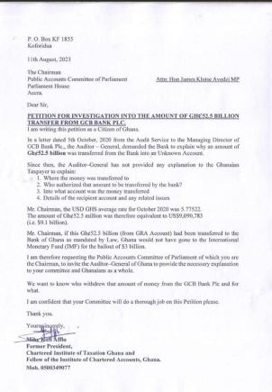 PETITION FOR INVESTIGATION INTO THE AMOUNT OF GH¢52.5 BILLION TRANSFER FROM GCB BANK PLC.I am writing this petition as a Citizen of Ghana.
