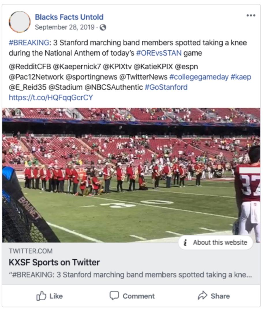 One of the Ghanaian trolls -- @africamustwake -- linked to a story from a left-wing conspiracy website and commented on Facebook: "America's descent into a fascist police state continues."