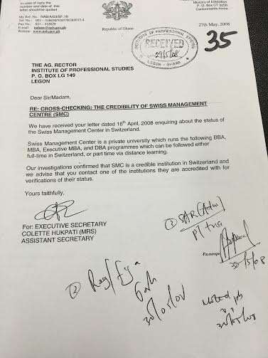 Prof Alabi, whose wife Dr. Goski Alabi and some lecturers at the UPSA acquired their doctorate degrees from SMC in a response to the Pulse.com,gh report backed his claim with a letter from the Board in 2008, signed by Assistant Secretary, Collette Hukpatti for the executive secretary of the NAB.