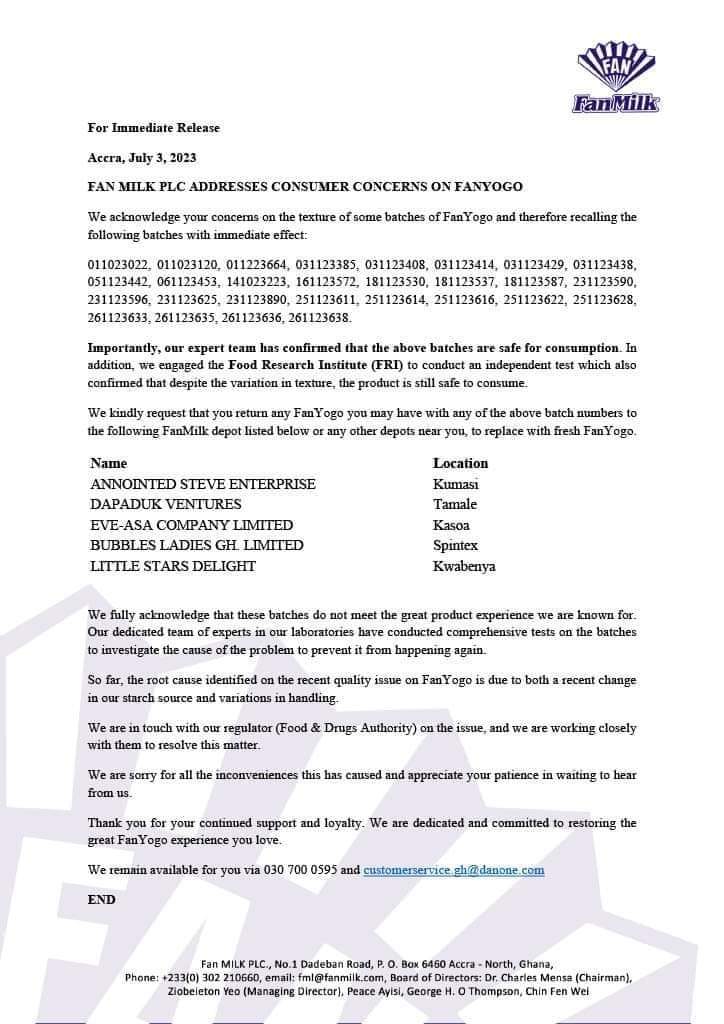 The company urged vendors to return FanYogo products with the above batch numbers to FanMilk depots.