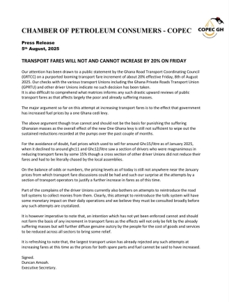 COPEC said the timing of the 20 per cent fare hike was poorly considered, given the ongoing economic hardships facing ordinary Ghanaians. It urged transport unions to reconsider the decision in order to cushion the already burdened commuting public.