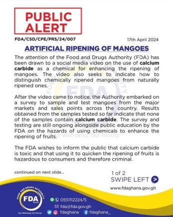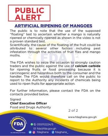 The Food and Drugs Authority (FDA) has issued a cautionary statement regarding the use of chemicals to accelerate the ripening of mangoes, citing potential health hazards.