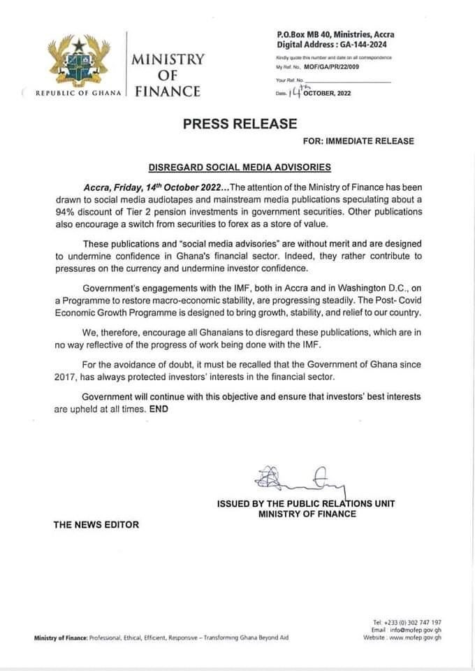 Accra, Friday, 14th October 2022...The attention of the Ministry of Finance has been drawn to social media audiotapes and mainstream media publications speculating about a 94% discount of Tier 2 pension investments in government securities. Other publications also encourage a switch from securities to forex as a store of value.