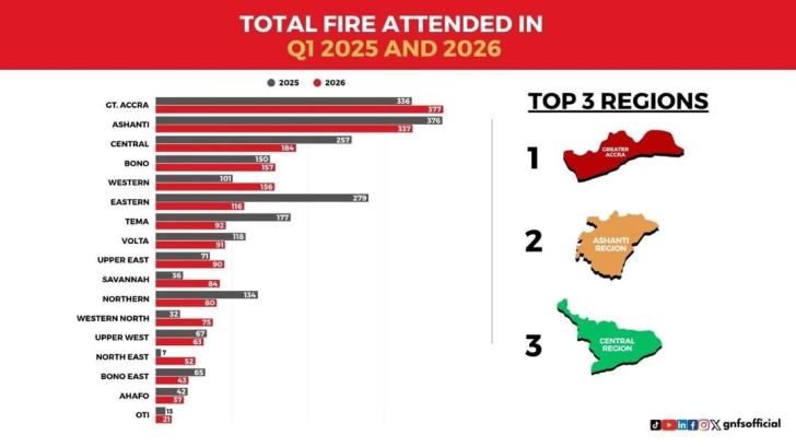 The Greater Accra Region recorded the highest number of fire incidents at 377, followed by the Ashanti Region with 337 cases, while the Oti Region recorded the lowest with 21 incidents.