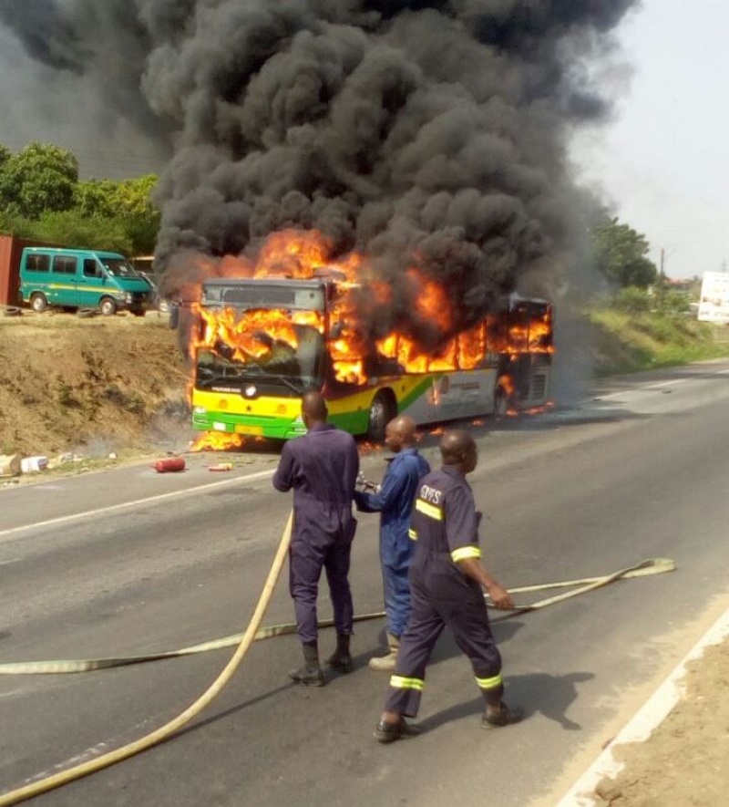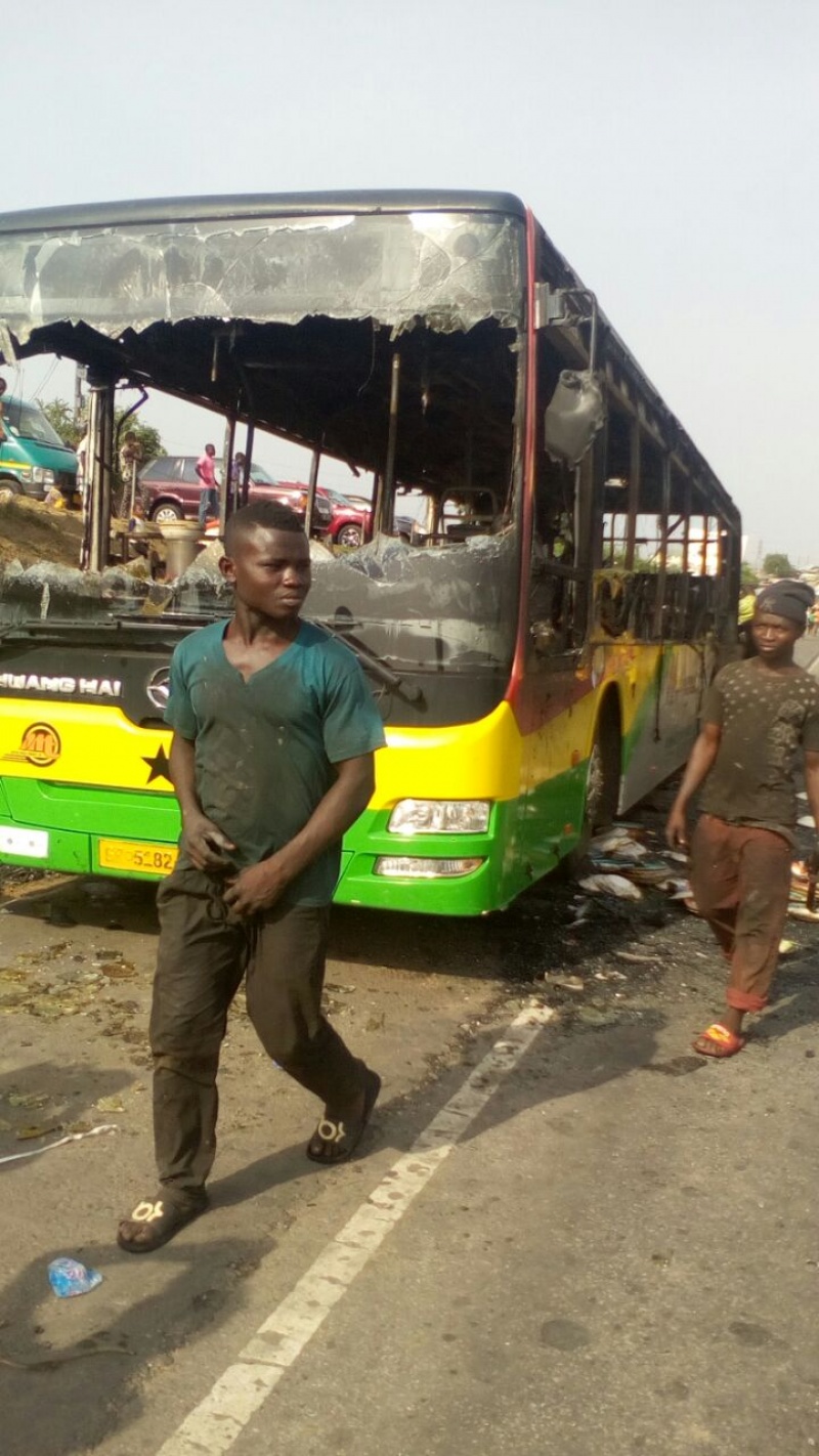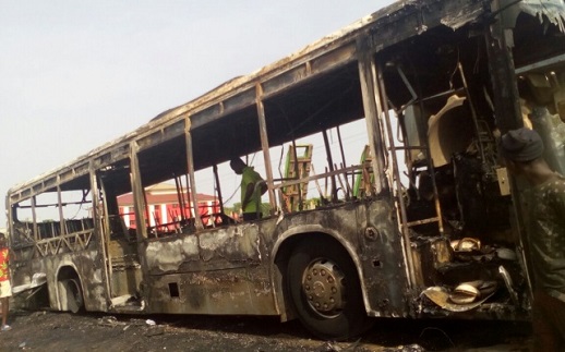 One of the newly acquired buses of the Metro Mass Transit was burnt beyond repairs on Wednesday at Opeikuma junction.