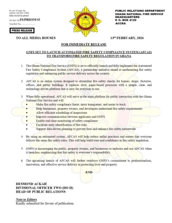 According to the GNFS, AFCAS will serve as the main platform for public interaction with the Service, enabling faster and more transparent compliance checks for homes, shops, factories, offices, and public buildings.