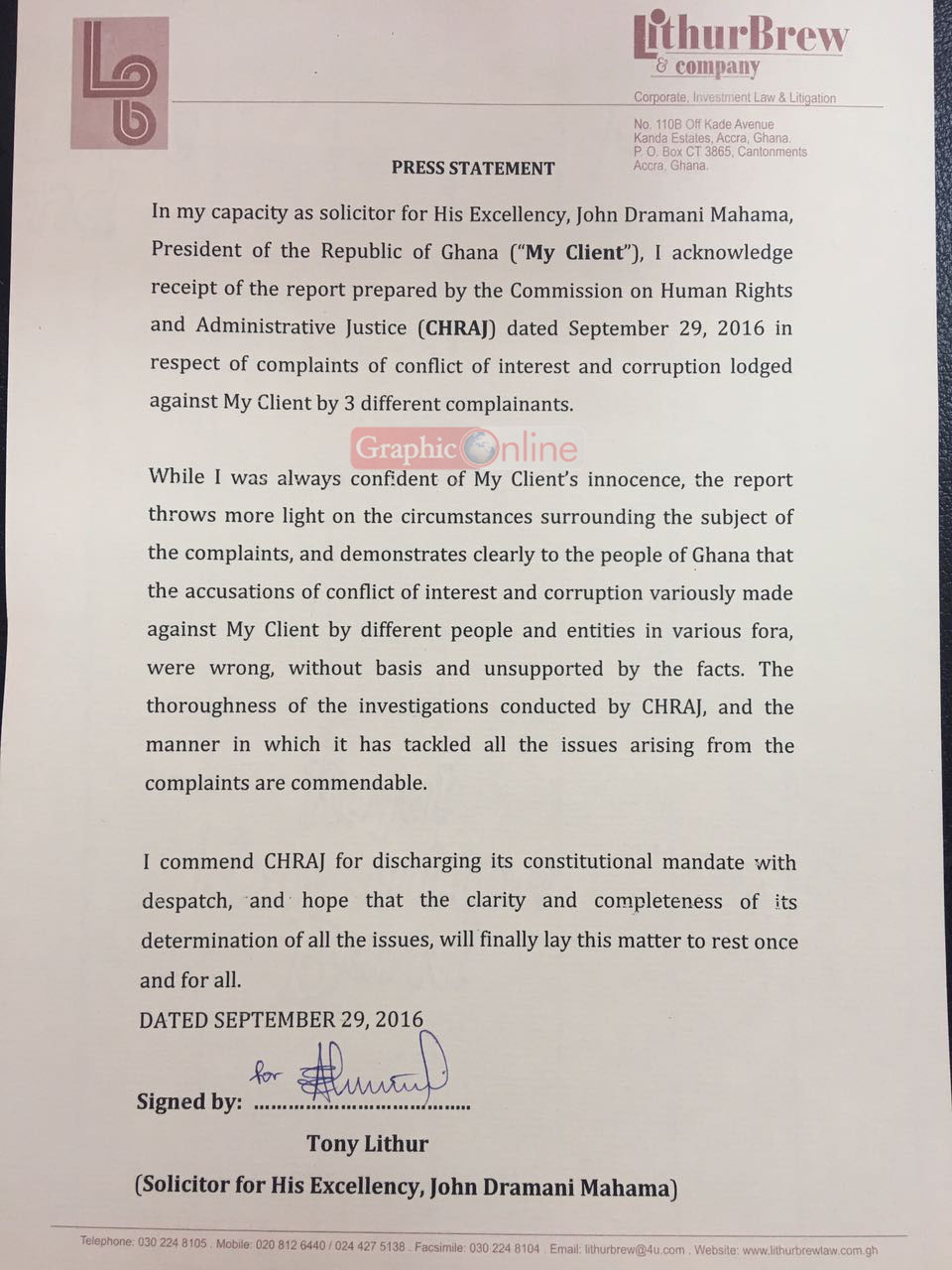 “I acknowledge receipt of the report prepared by Commission on Human Rights and Administrative Justice (CHRAJ) dated September 29, 2016 in respect of complaints of conflict of interest and corruption lodged against my client by 3 different complainants,” he wrote in the statement.