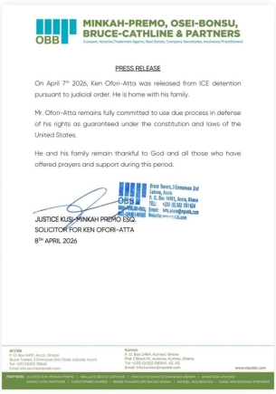 "On April 7th 2026, Ken Ofori-Atta was released from ICE detention pursuant to judicial order. He is home with his family," the statement read.