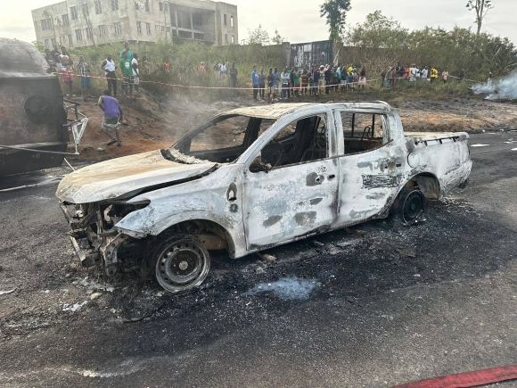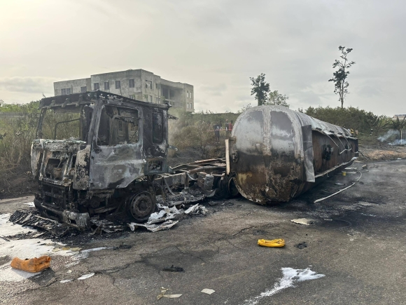 Three people burnt, several injured in Suhum-Accra tanker explosion after driver lost control according to police; 10 vehicles burnt
