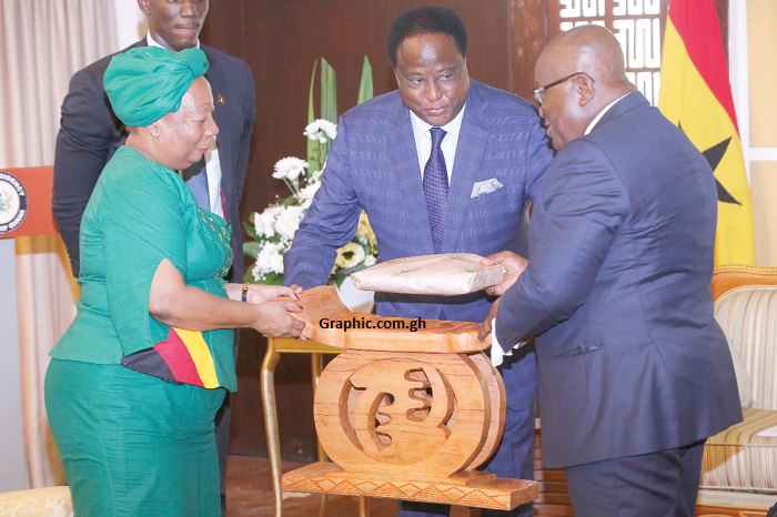 Mrs. Pavelyn Tenclai Musaka (left), outgoing Zimbabwean Ambassador to Ghana receiving a gift from President Akufo-Addo (right)
