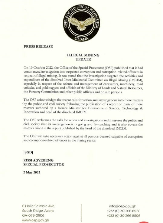 The OSP in a press release dated May 2, 2023 assured the public that it was already conducting a far-reaching investigation into suspected corruption and corruption-related offences in the illegal mining sector.