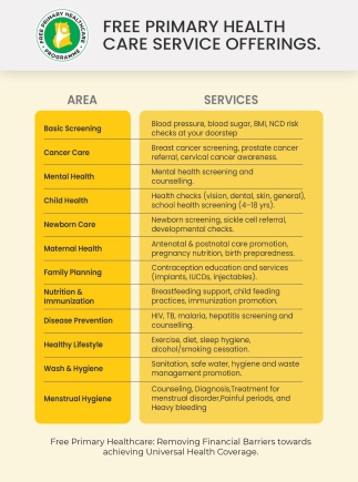 The Ministry of Health has unveiled the full range of services to be provided under the Free Primary HealthCare initiative, describing the ambitious programme as "healthcare at your doorstep" and a bold step toward removing financial barriers to universal health coverage.