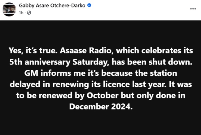 “Yes, it’s true. Asaase Radio 99.5, which celebrates its 5th anniversary Saturday, has been shut down,” Mr Otchere-Darko posted across his social media platforms on Thursday, June 12, 2025.