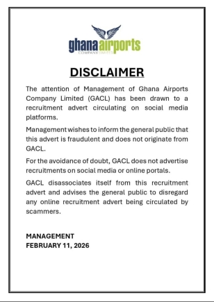 The Ghana Airports Company Limited (GACL) has issued a disclaimer alerting the public to a fraudulent recruitment advertisement circulating on social media.