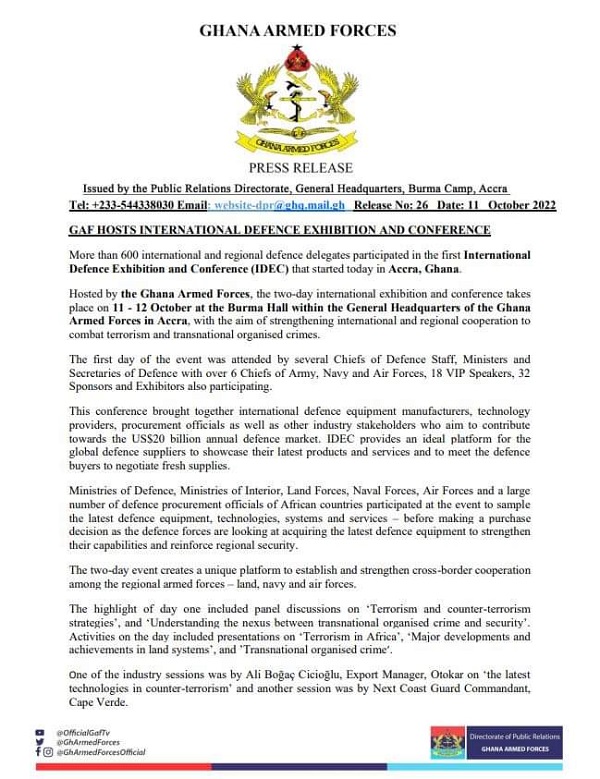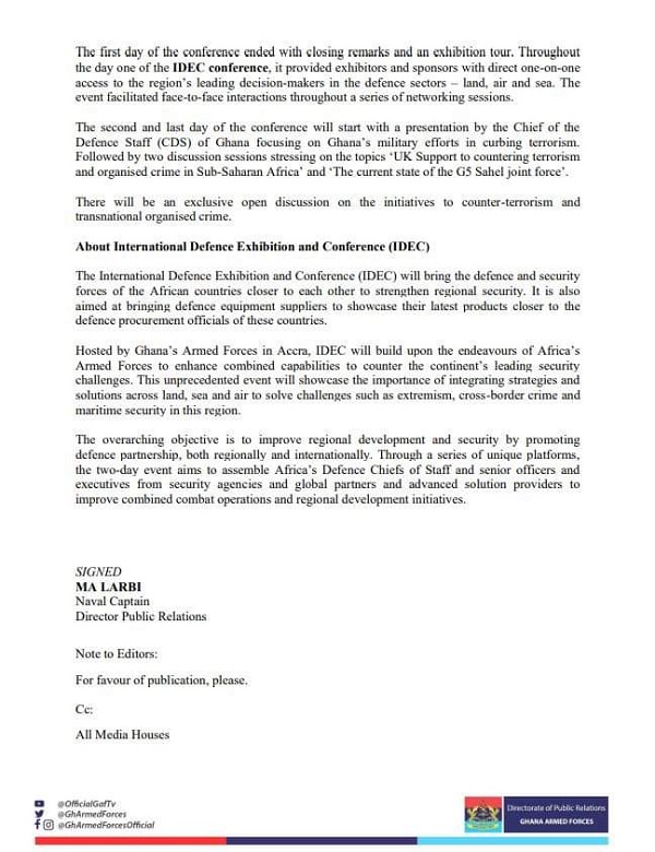 A press release issued by the Director of Public Affairs at the GAF, Naval Captain Michael Addo Larbi said more than 600 international and regional delegates are participating in the two-day conference.