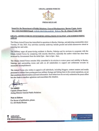 “The Ghana Armed Forces remains fully committed to its mission to restore peace and stability in Bawku, Nalerigu and surrounding towns and calls on all stakeholders to support and collaborate towards its successful accomplishment,” the statement read.