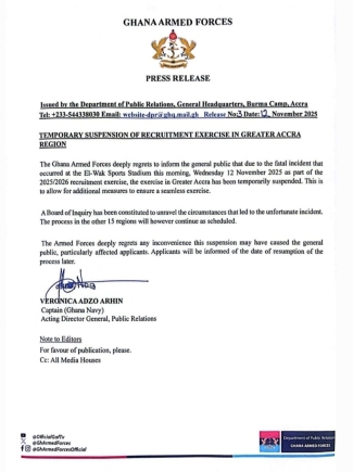 The Ghana Armed Forces (GAF) has temporarily suspended the recruitment exercise at the El-Wak Stadium in Accra following the deadly stampede on Wednesday morning.
