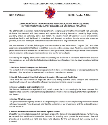 COMMUNIQUÉ FROM THE OLD VANDALS' ASSOCIATION, NORTH AMERICA (OVANA) ON THE DEVASTATING IMPACT OF GALAMSEY AND URGENT CALL FOR ACTION