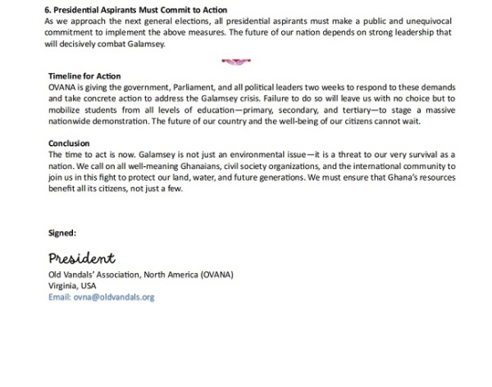 OVANA is giving the government, Parliament, and all political leaders two weeks to respond to these demands and take concrete action to address the Galamsey crisis. Failure to do so will leave us with no choice but to mobilize students from all levels of education-primary, secondary, and tertiary-to stage a massive nationwide demonstration. The future of our country and the well-being of our citizens cannot wait.