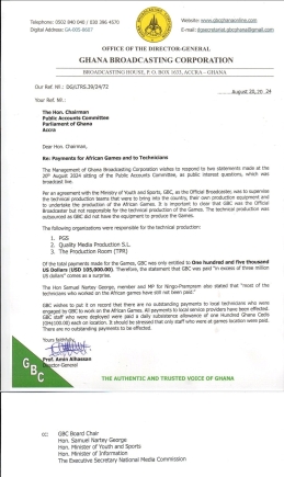 Meanwhile, in a letter dated August 20, 2024 and addressed to the Chairman of the Public Accounts Committee of Parliament, the GBC Director General, Prof Amin Alhassan clarified that per an agreement with the Ministry of Youth and Sports, GBC, as the Official Broadcaster, was to supervise the technical production teams that were to bring into the country, their own production equipment and to undertake the production of the African Games.