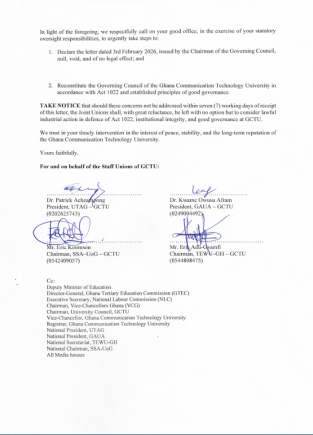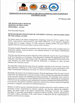 Staff unions at the Ghana Communication Technology University (GCTU) have petitioned the Minister for Education to dissolve and reconstitute the university’s Governing Council, following what they describe as a unilateral decision by the Council Chairman to terminate the appointment of the Vice-Chancellor.