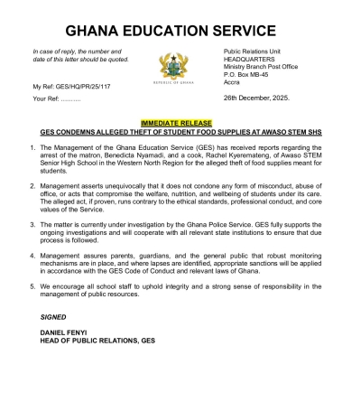 In a statement dated December 26, 2026 [copy attached below] the Ghana Education Service said it does not condone any form of misconduct, abuse of office, or actions that compromise the welfare, nutrition, and wellbeing of students.