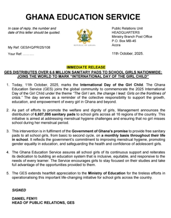 In a statement signed by the Head of Public Relations at GES, Daniel Fenyi, the service reaffirmed its dedication to building an inclusive and equitable education system that responds to the needs of every learner. It also encouraged girls to remain focused on their studies and take advantage of the opportunities provided.