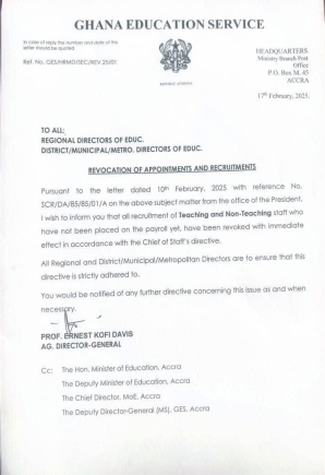 The Ghana Education Service (GES) has revoked all appointments and recruitments of teaching and non-teaching staff who have yet to be placed on the government payroll.