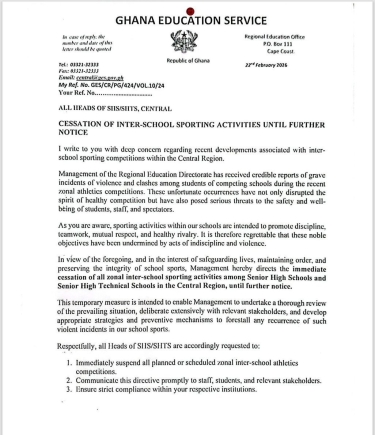 In a letter dated February 22 and issued by the Central Regional Education Directorate, the Service said it had received credible reports of serious clashes among students during zonal athletics events, raising concerns about the safety of students, staff and spectators.