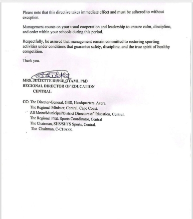 The directive, signed by the Central Regional Director of Education, Juliette Dubie Otami, stated that the incidents had disrupted the spirit of healthy competition and undermined the core values of discipline, teamwork and mutual respect that school sports are intended to promote.