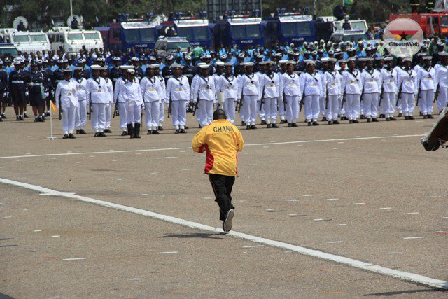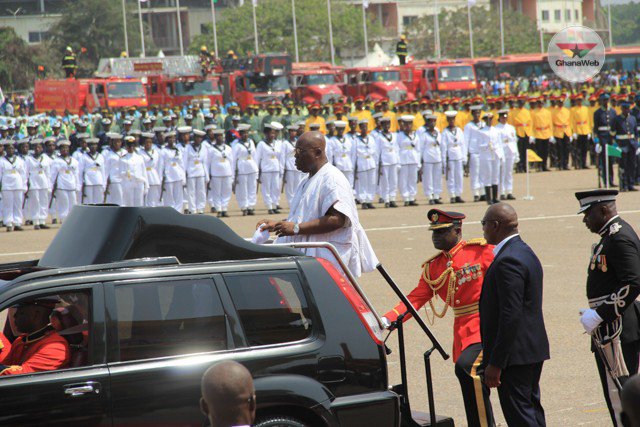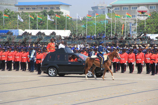 The president took his first ride on the national ceremonial vehicle to inspect the contingent formed by the Ghana Armed Forces, Ghana Navy, Ghana Air Force, Ghana Prisons, Ghana Police, Ghana National Fire Service, Ghana Prisons, Customs Division of Ghana Revenue Authority, Ghana Immigration Service and the schools contingent.