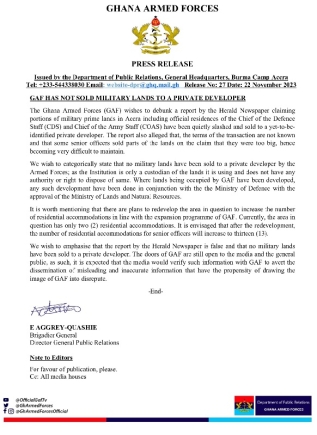 The Ghana Armed Forces (GAF) has debunked a media report claiming portions of military lands in Accra, including the official residences of the Chief of the Defence Staff (CDS) and Chief of the Army Staff (COAS) have been slashed and sold to a private developer.