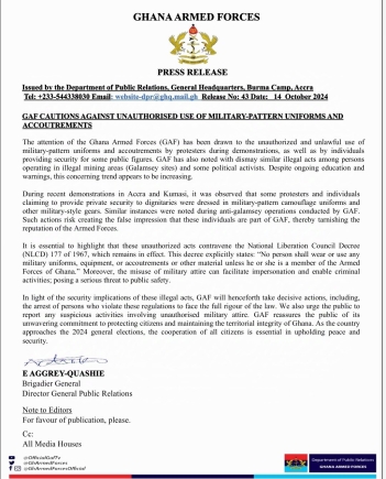 In a statement released on October 14, 2024 by the Director-General of Public Relations, Brigadier General Eric Aggrey-Quashie, the Ghana Armed Forces expressed concern over the illegal and unauthorised use of military-pattern uniforms by protesters during demonstrations and individuals providing security for certain public figures.
