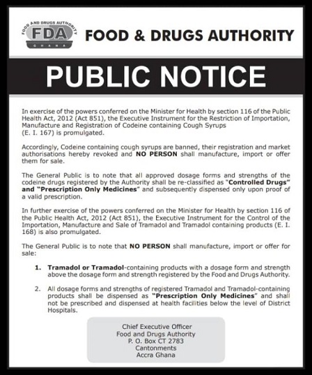 A public notice by the Food and Drugs Authority (FDA) noted that all approved dosage forms and strengths of codeine drugs registered by the FDA shall be reclassified as "Controlled Drugs" and "Prescription Only Medicines" and subsequently dispensed only upon proof of a valid prescription.
