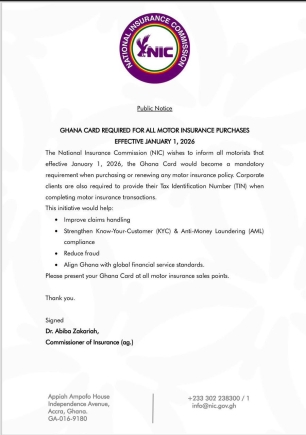 “The National Insurance Commission (NIC) wishes to inform all motorists that effective January 1, 2026, the Ghana Card would become a mandatory requirement when purchasing or renewing any motor insurance policy,” the notice stated. It added that “corporate clients are also required to provide their Tax Identification Number (TIN) when completing motor insurance transactions.”