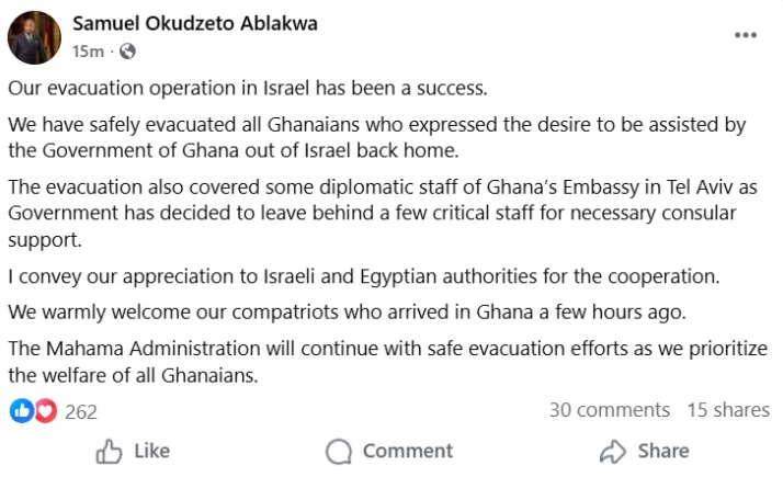The Minister for Foreign Affairs, Samuel Okudzeto Ablakwa, has announced the successful evacuation of Ghanaians from Israel following recent developments in the country.