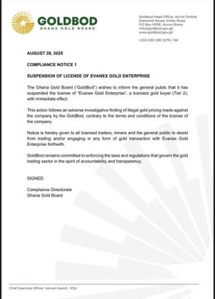 The Ghana Gold Board (GoldBod) has announced the immediate suspension of the license of Evanex Gold Enterprise, a Tier 2 licensed gold buyer.