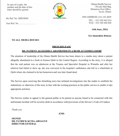 The attention of leadership of the Ghana Health Service has been drawn to a media story about a patient allegedly abandoned in a bush at Gomoa Ojobi in the Central Region. According to the story, it is alleged that the said patient was on admission at the Trauma and Specialist Hospital in Winneba and after her relatives had failed to show up, she was conveyed in the hospital's ambulance and left in a wheelchair at Ojobi where she claimed to be her hometown and was later found dead.