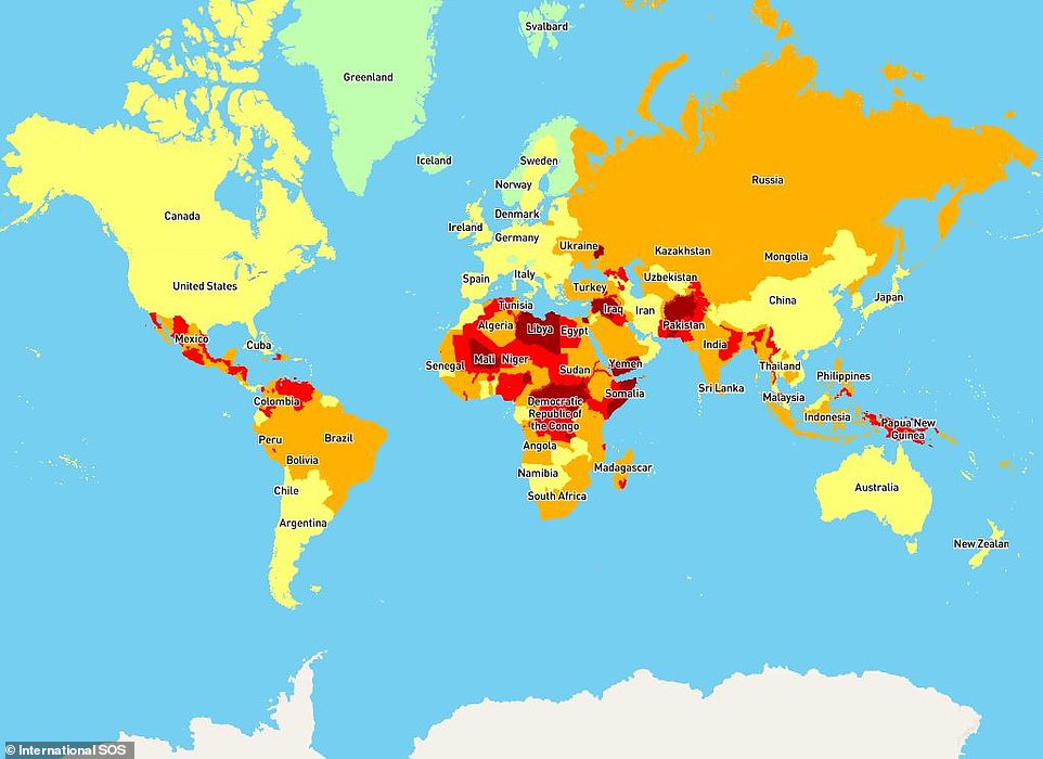 In contrast, Norway, Finland and Iceland were all labelled as having a low risk of medical problems, security and road safety issues, meaning they are the safest - along with the likes of Sweden and Greenland.