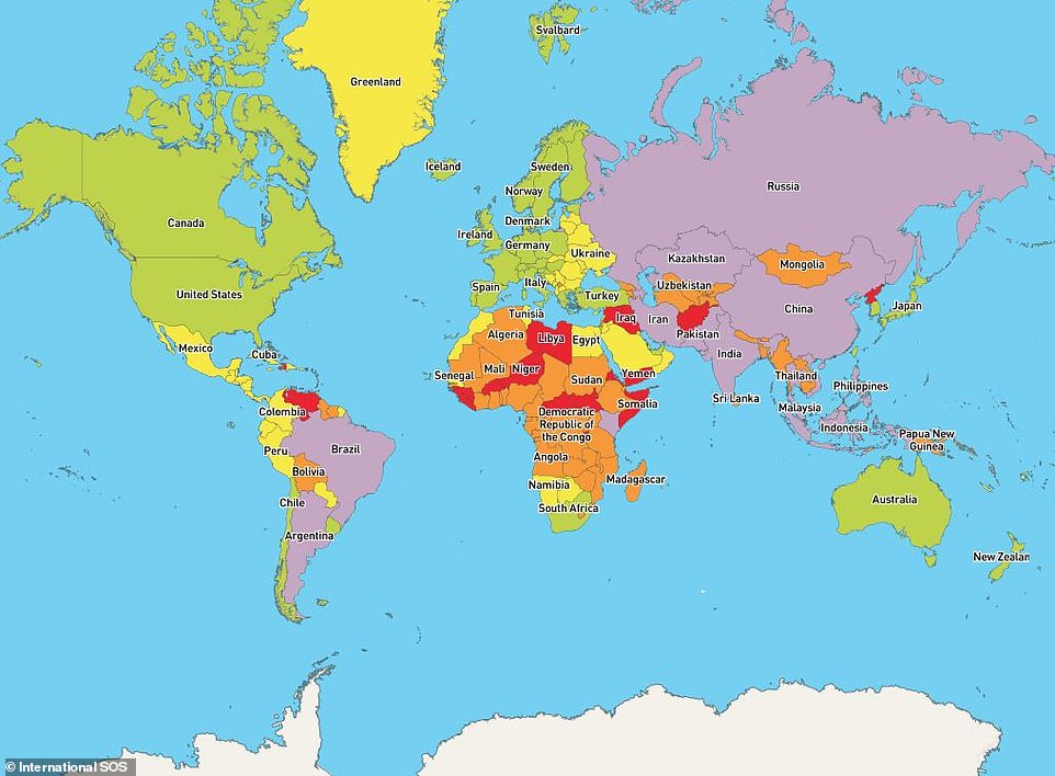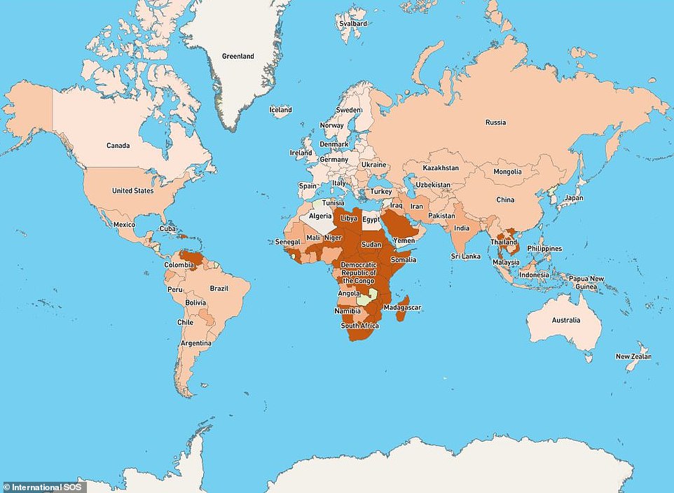 This map, by International SOS, shows the places most likely to put your health at risk. Low-risk countries are marked in green, medium in yellow, high in orange, very high in red and those that have a 'variable', such as Brazil and Russia, are marked in purple