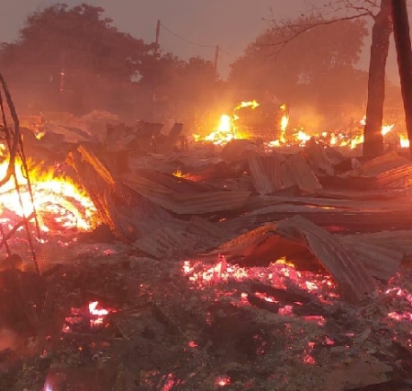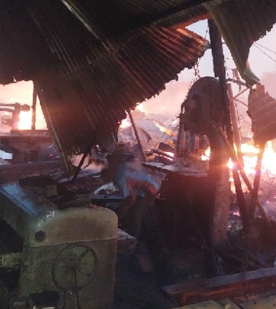The intense blaze, which engulfed several shops dealing in wooden planks and hardware materials, was brought under control through coordinated efforts.