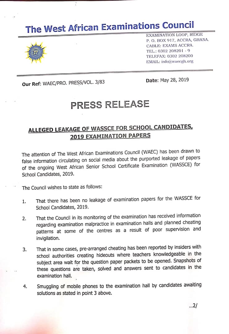 1. That there has been no leakage of examination papers for the WASSCE for School Candidates, 2019.