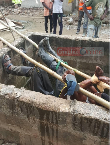 She said the two men were found tied separately to the bamboo sticks suspended over the manhole at the construction site where they had been working on the construction of a private building.